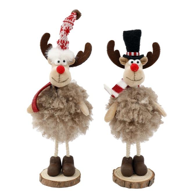 Soft Reindeer with Long Legs and Fluffy Pom Pom Belly on a Small Wood Base - 26cm - Ornaments, Christmas Gift Decor Wooden Decoration